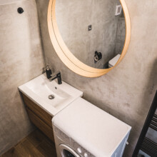 The apartment is new, cozy, and very modernly furnished. It is divided into two rooms and a bathroom: one serves as a bedroom, and the other as a living room with a sofa bed, kitchenette, and dining table.